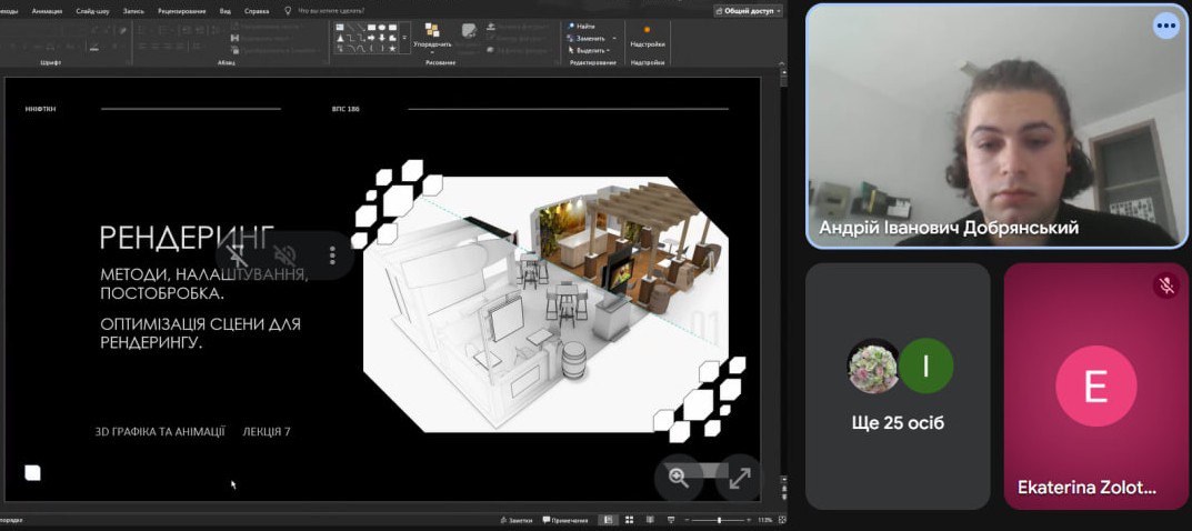 17 жовтня, в рамках педагогічної практики, аспірант групи ВТ-з41ф, Андрій Добрянський, яку він проходить у Чернівецькому національному університеті ім. Ю. Федьковича, для всіх охочих провів відкриту онлайн-лекцію на тему "3D графіка та анімація". Учасники активно долучилися до обгворення теми та в жвавій дискусії розглянули методи, налаштування, постобробку та особливості оптимізації сцени для рендерингу.
