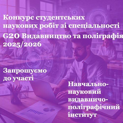 Запрошуємо здібну молодь — студентів, магістрантів взяти участь у Всеукраїнському конкурсі студентських наукових робіт зі спеціальності G20 Видавництво та поліграфія у 2025-2026 навчальному році.